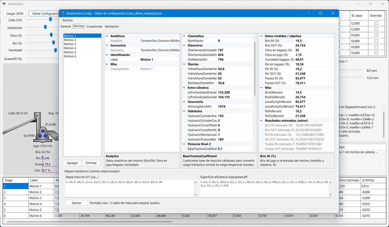 Visualice en un solo entorno las etapas del tándem, los balances por molino, la imbibición, los reciclos, las variables de calidad del jugo y los indicadores mecánico-geométricos críticos para análisis técnico y entrenamiento.