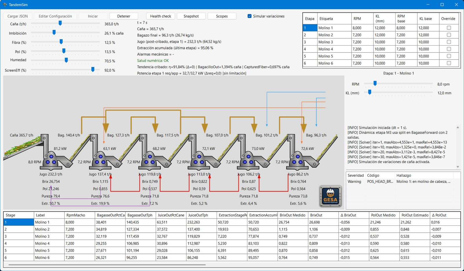 Visualice en un solo entorno las etapas del tándem, los balances por molino, la imbibición, los reciclos, las variables de calidad del jugo y los indicadores mecánico-geométricos críticos para análisis técnico y entrenamiento.